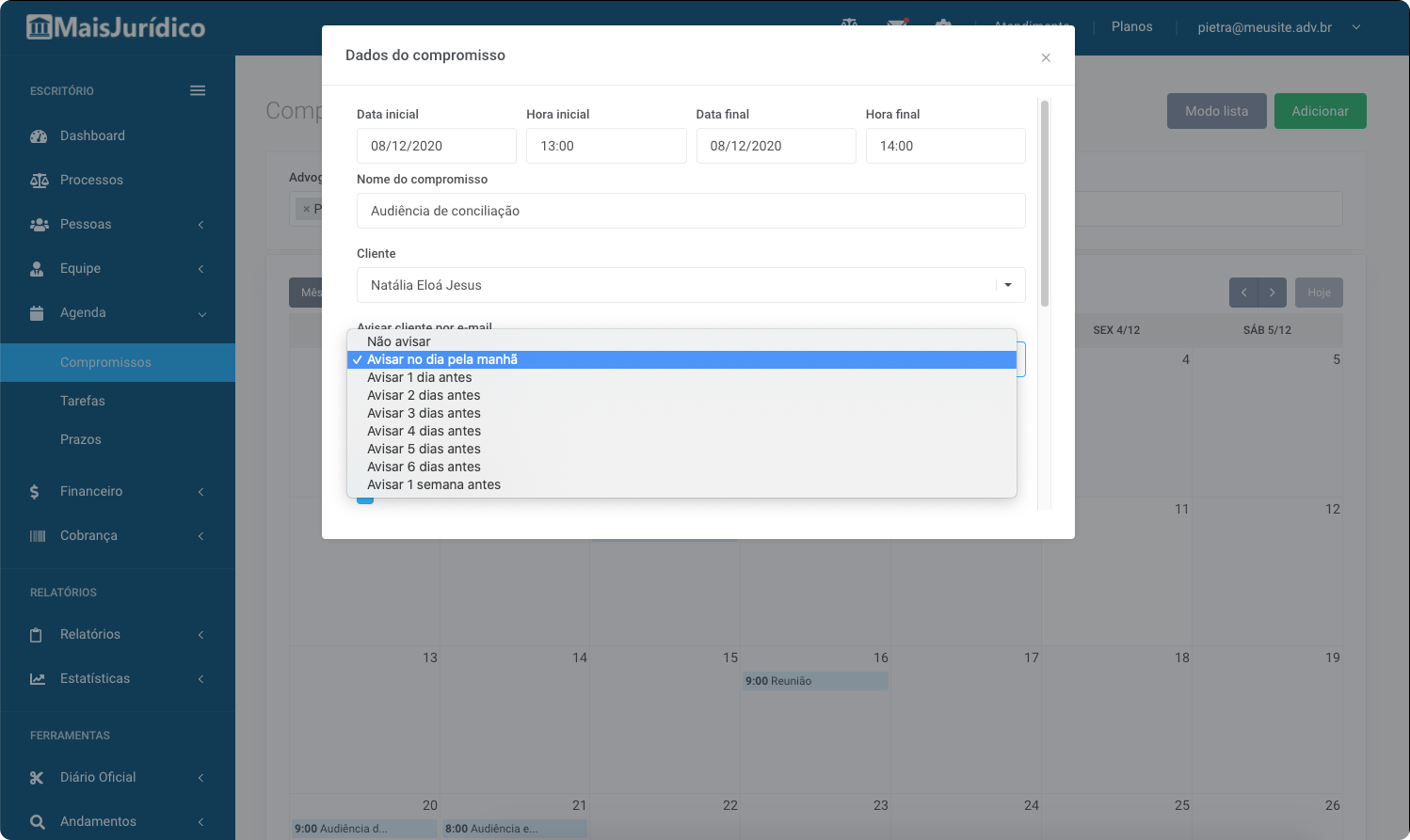 Organize sua agenda entre compromissos, prazos e tarefas, configure lembretes, atribua compromissos a outros advogado da equipe, defina prazos para os andamentos dos processos e muito mais.