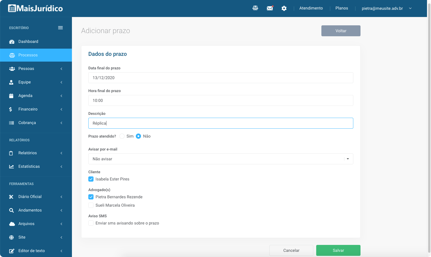 Com o nosso recurso de alertas por e-mail e SMS, sua mente fica livre para focar no que é importante e você ganha produtividade. Escolha a antecedência do envio dos lembretes, quais advogados devem recebê-los e se o seu cliente deve recebê-lo.