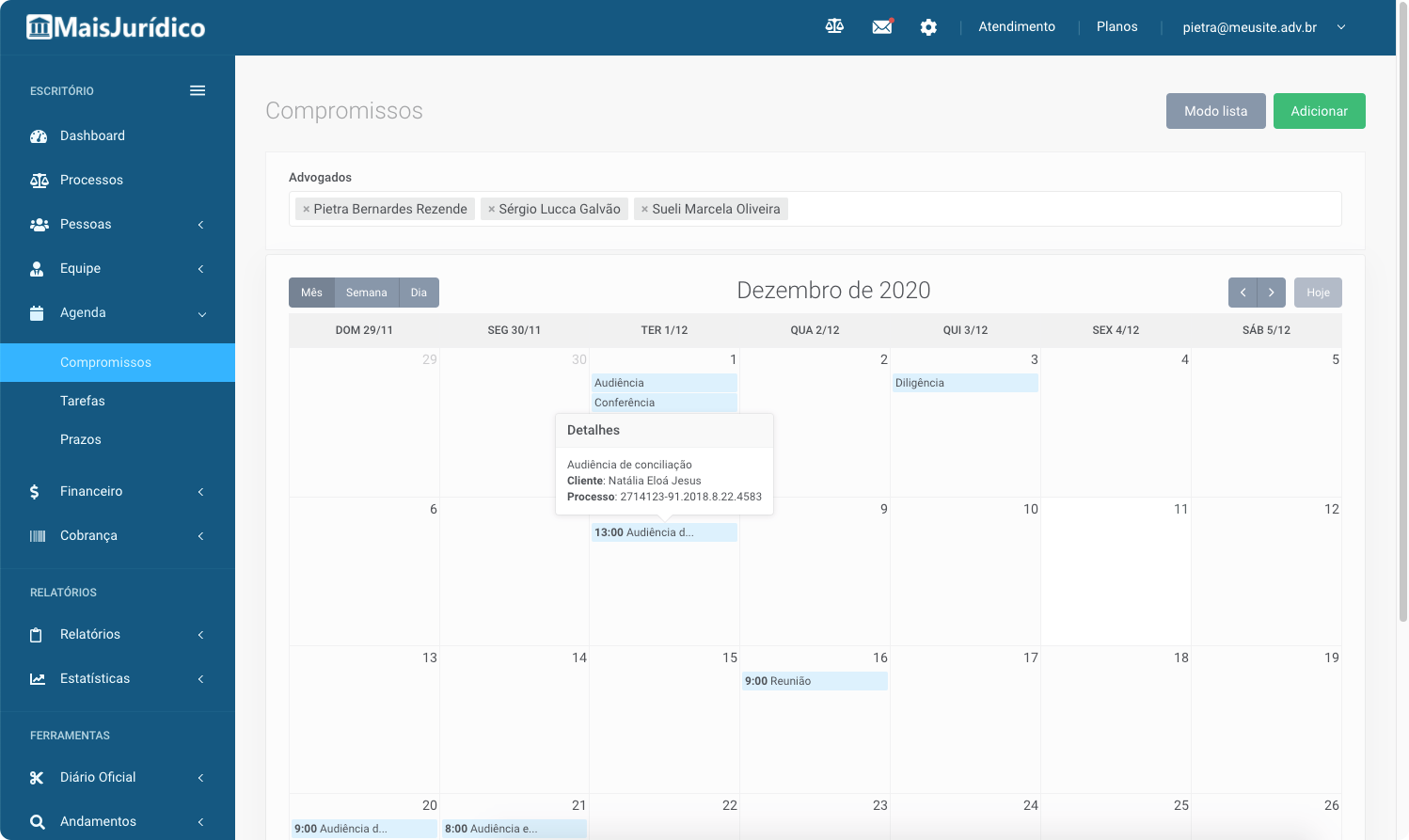 Com o MaisJuridico, a sua agenda e da sua equipe ficam organizadas e centralizadas, para que nenhum compromisso seja esquecido.