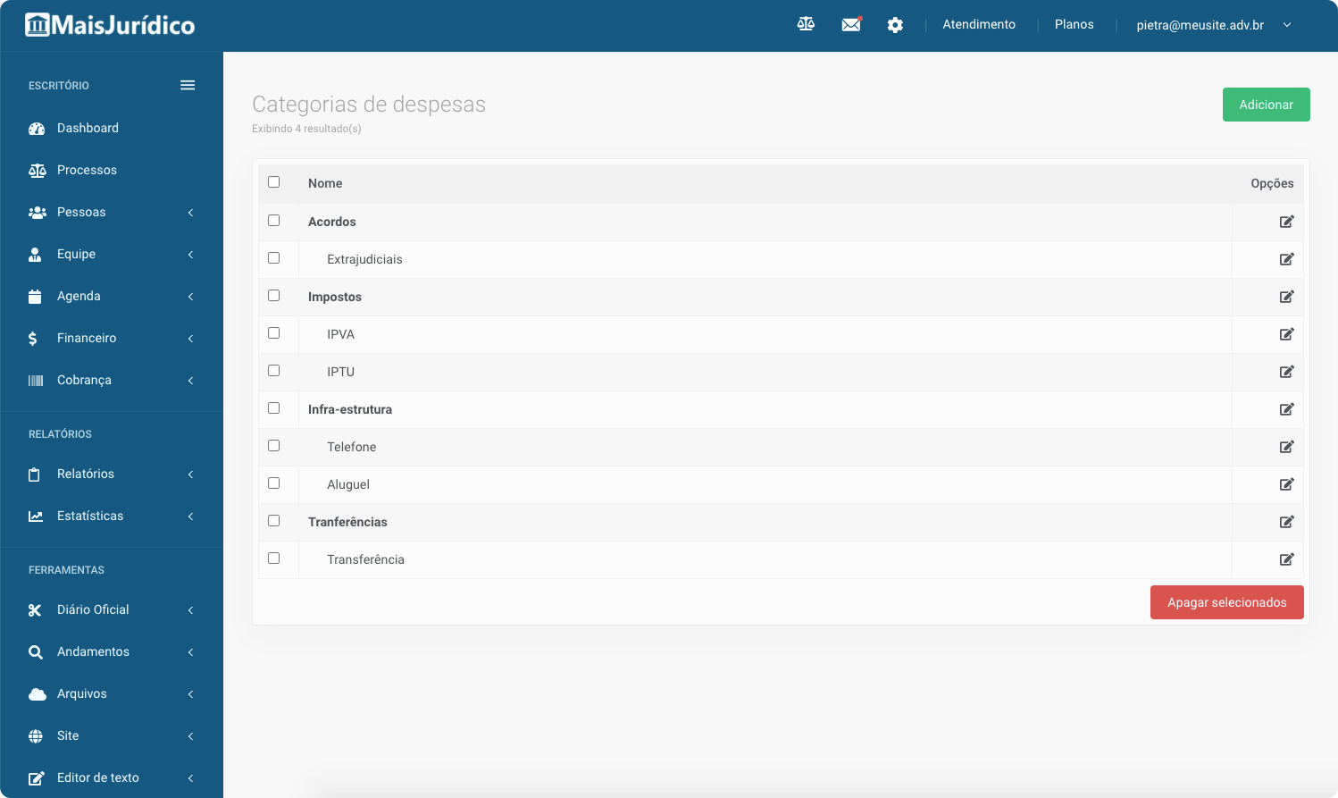 Personalize as categorias e subcategorias das receitas e despesas, crie contas virtuais para refletir a realidade do escritório, emita boletos registrados a partir de honorários e muito mais.