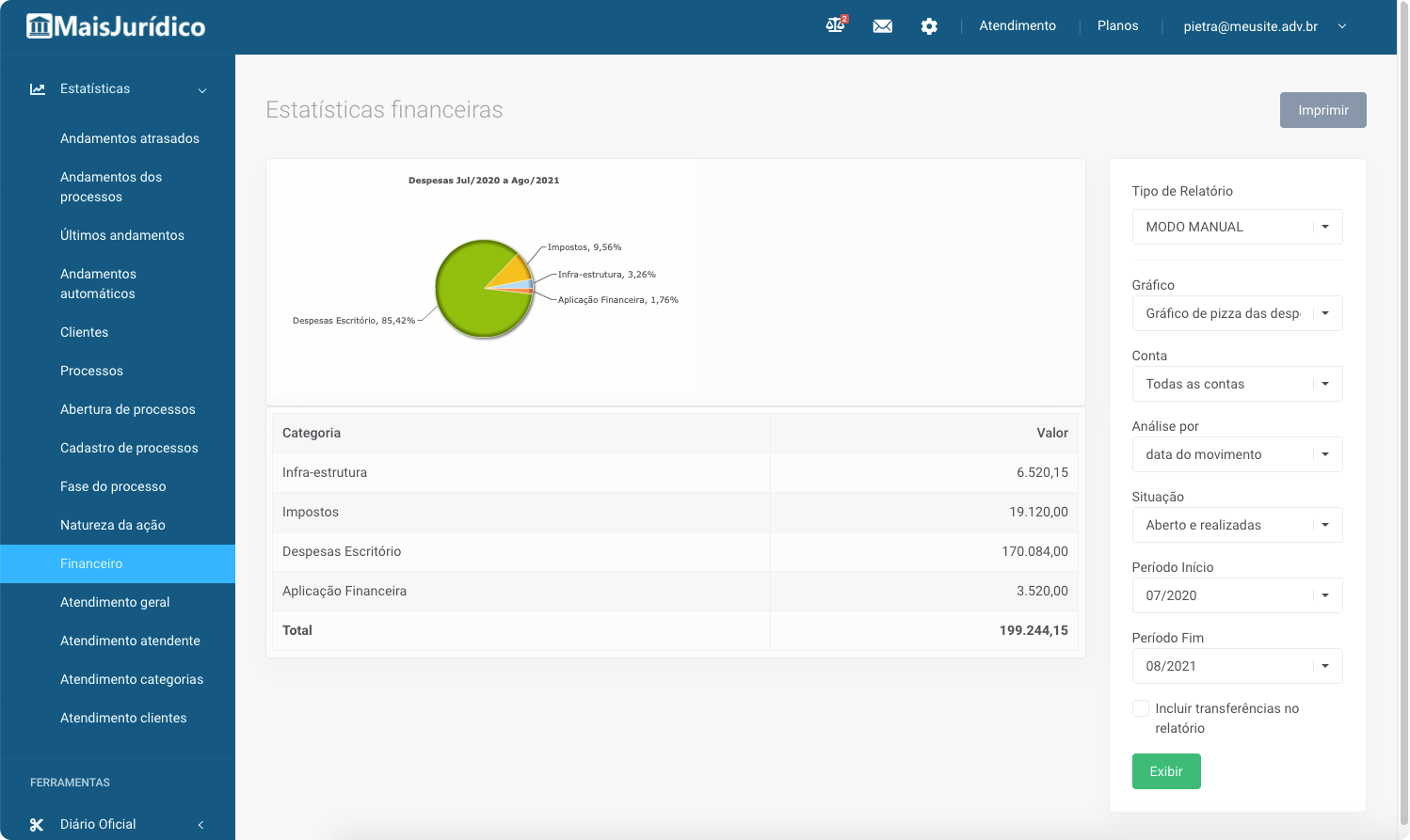 Possui todas as opções para você organizar o seu fluxo de caixa, emitir relatórios e estatísticas e emitir boletos a partir de custas e honorários.