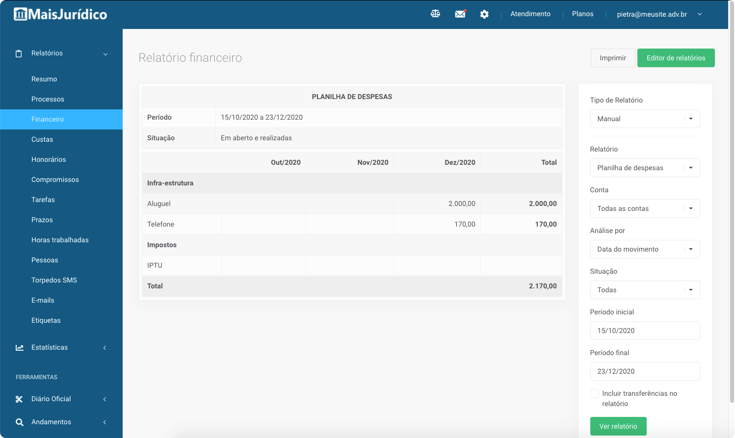 Controle todo o fluxo financeiro do seu escritório, organizando custas e honorários por processo e as receitas e despesas gerais do escritório.