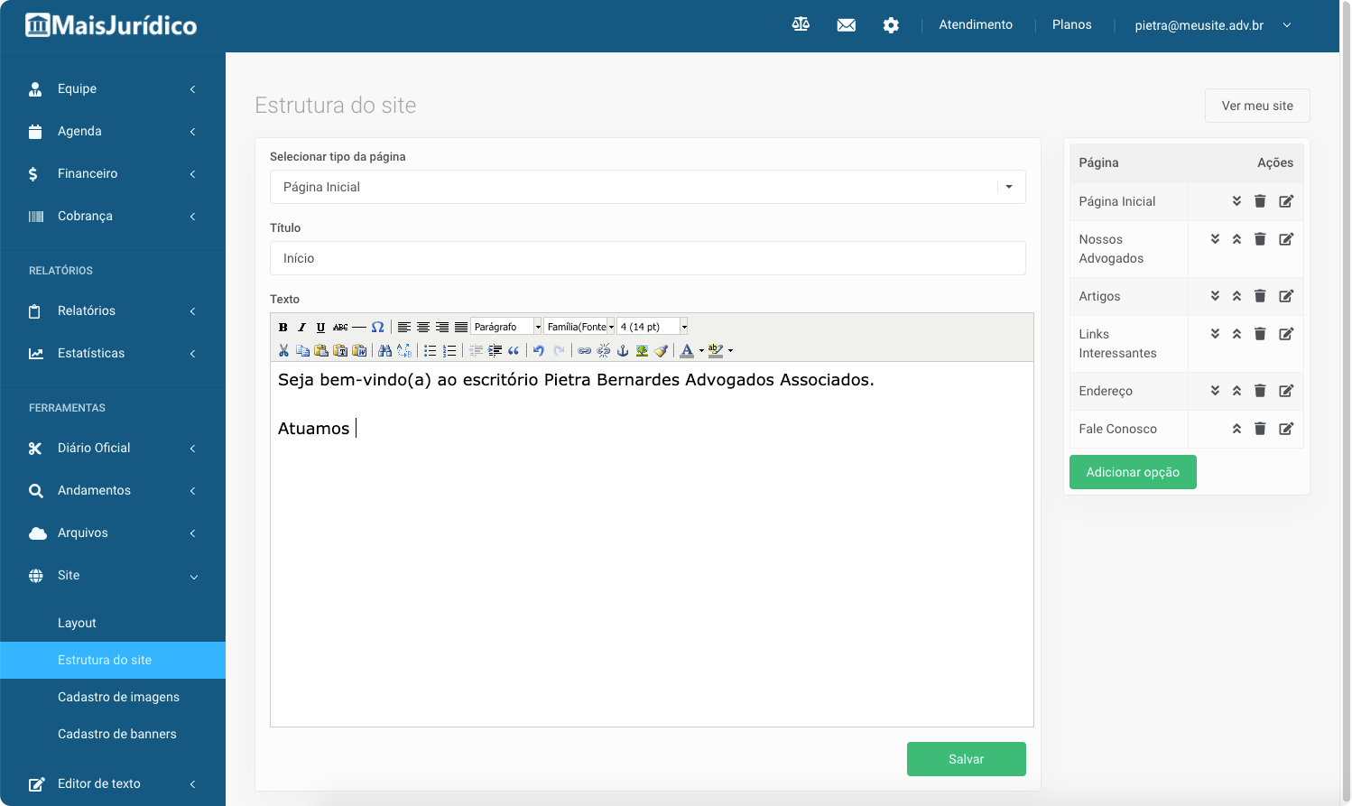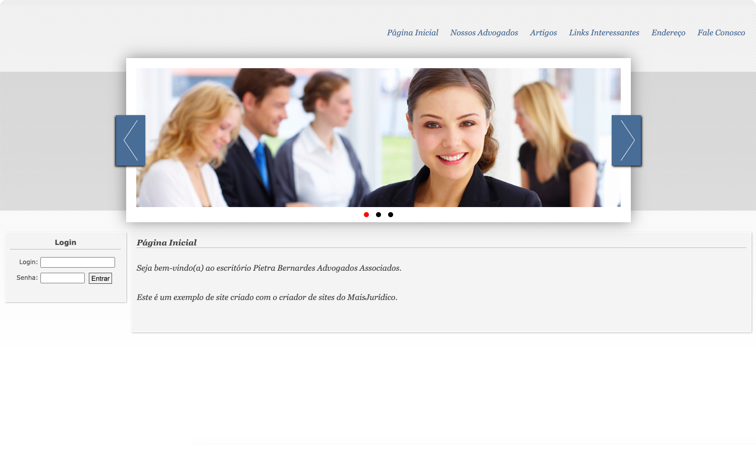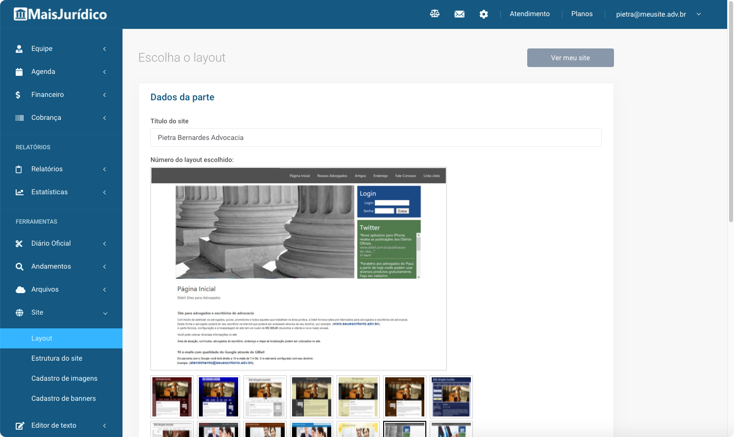 Escolha um layout e crie as páginas de conteúdo com facilidade. Seus clientes poderão acessar os processos cadastrados no MaisJurídico, sistema para setor jurídico, diretamente pelo seu site!